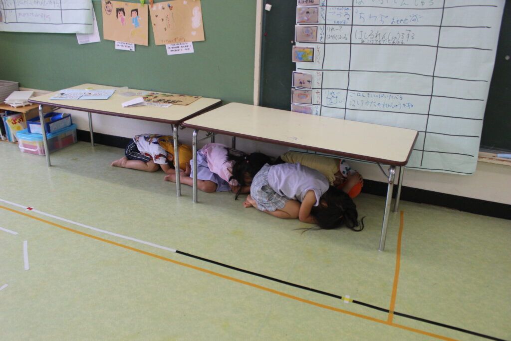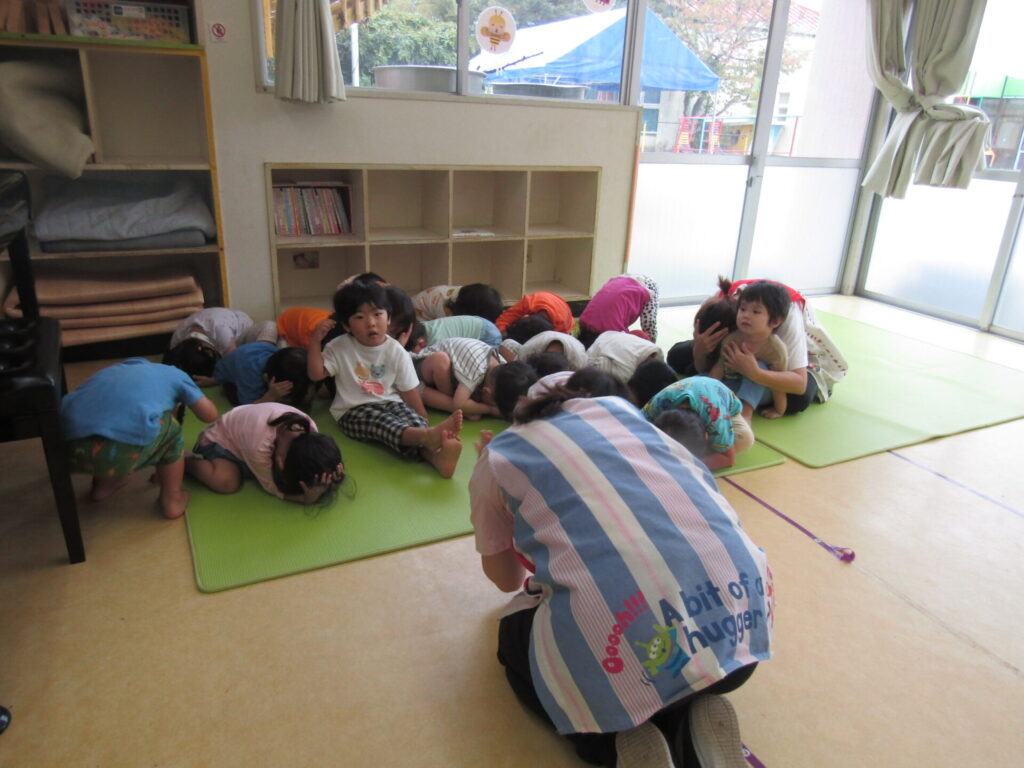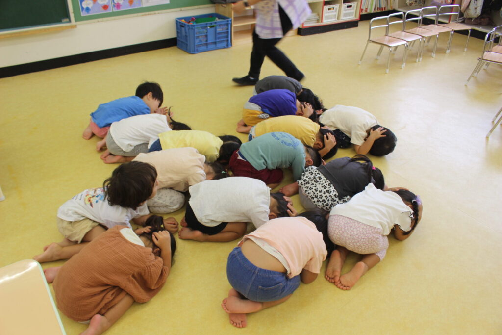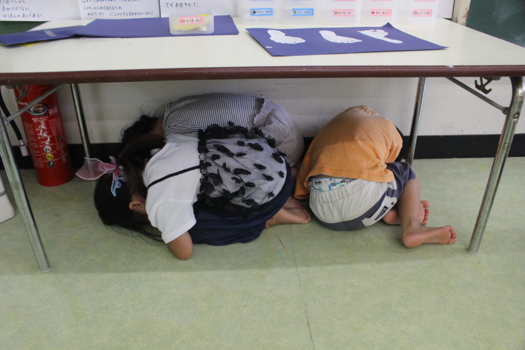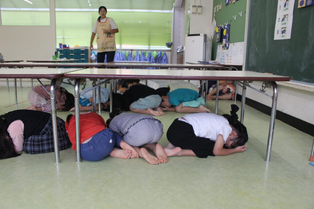 訓練が終わった後も、「つくえのしたにかくれるんよ!!」「ダンゴムシポーズじょうずにできるんよ!!」と話していた子どもたちでした!