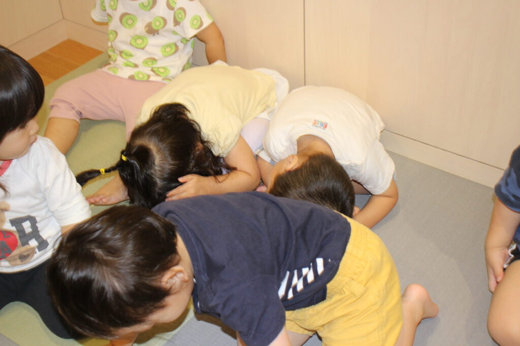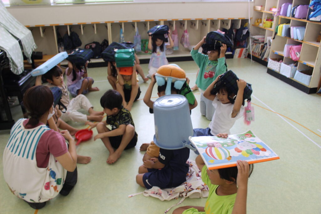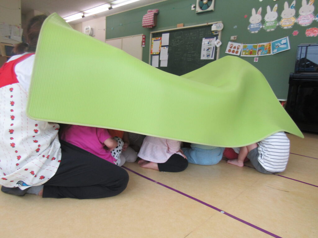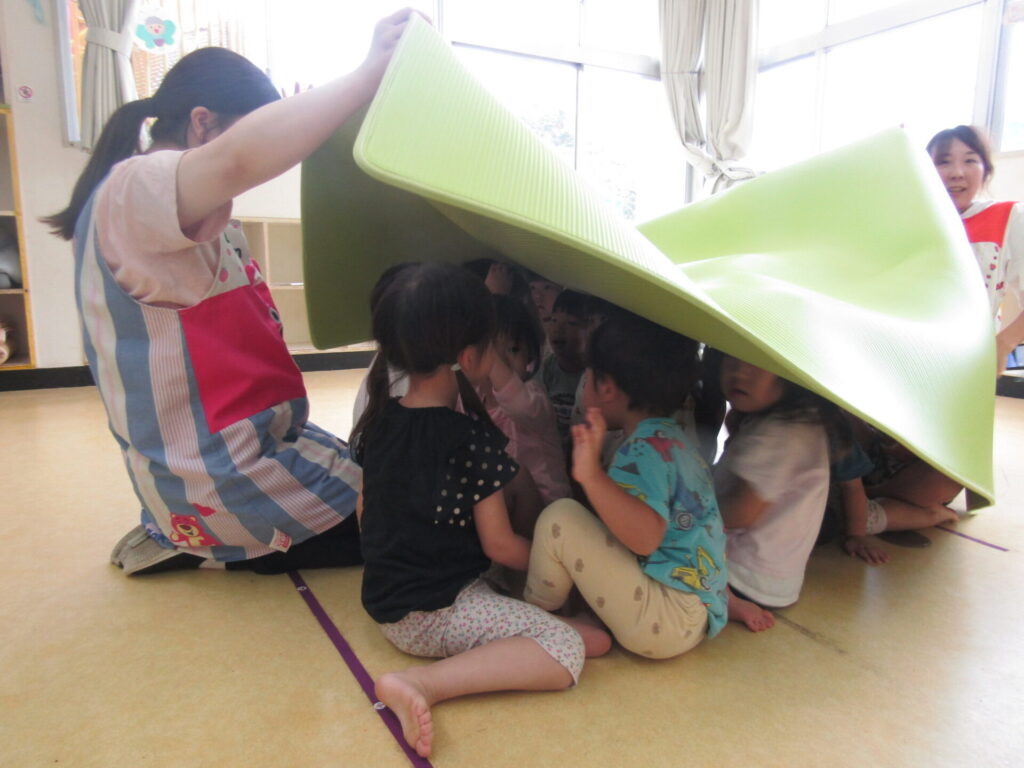 訓練が終わった後も、「つくえのしたにかくれるんよ!!」「ダンゴムシポーズじょうずにできるんよ!!」と話していた子どもたちでした!