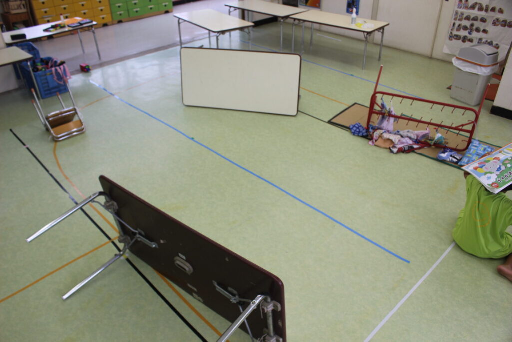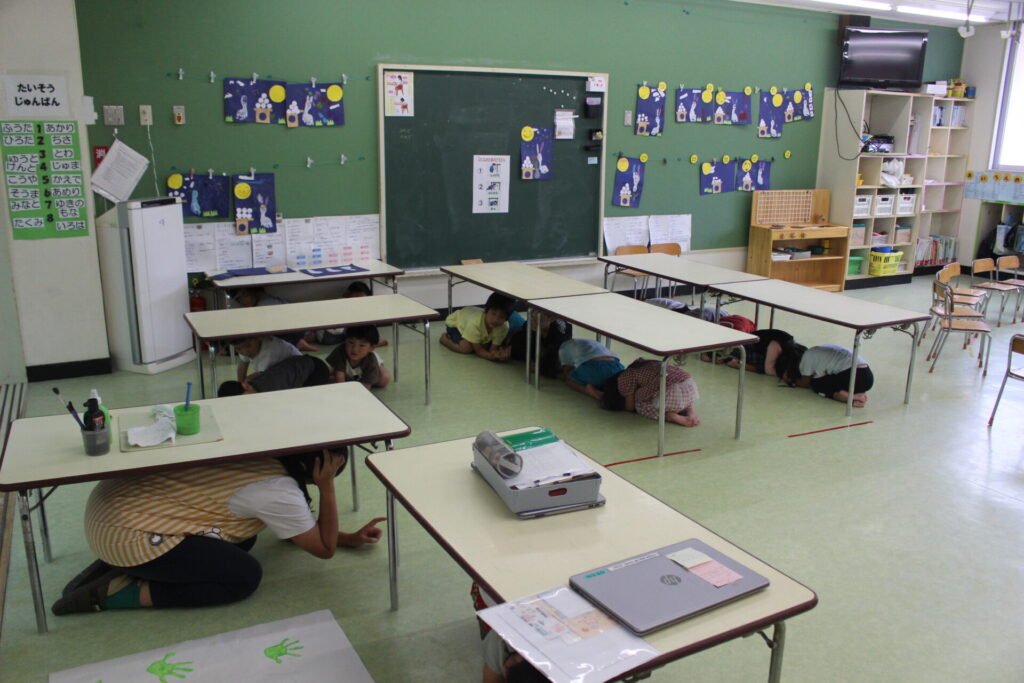 実際に机やタオル掛けなどが倒れた場面を作り、身近なもので頭を守る練習をするクラスもありましたよ。