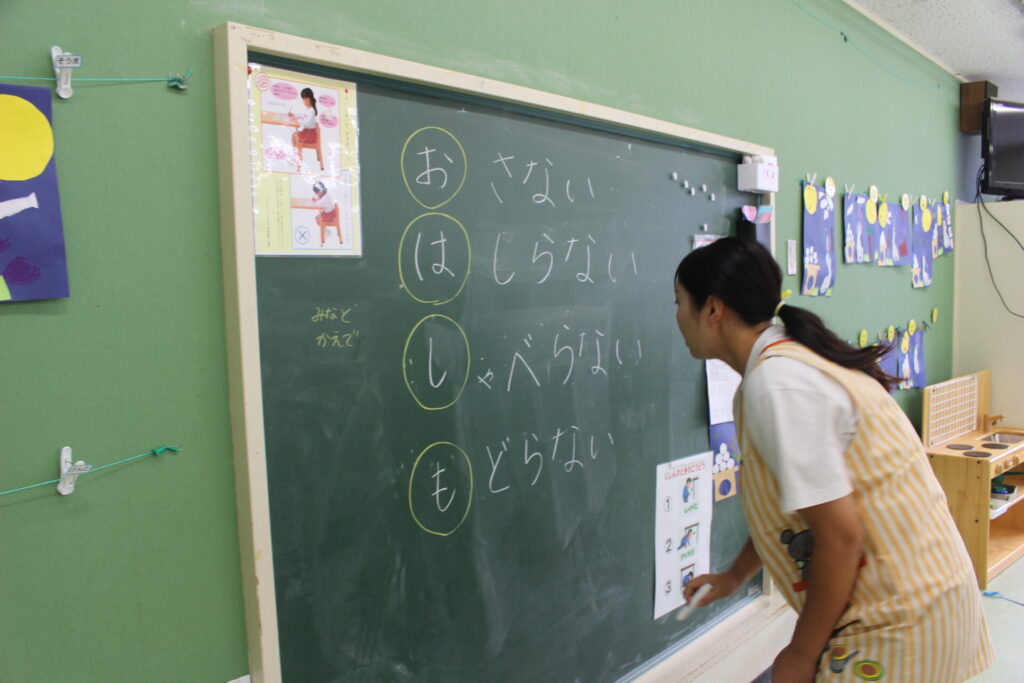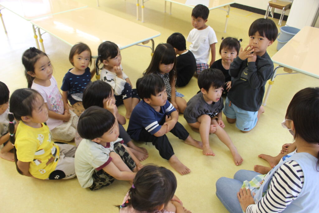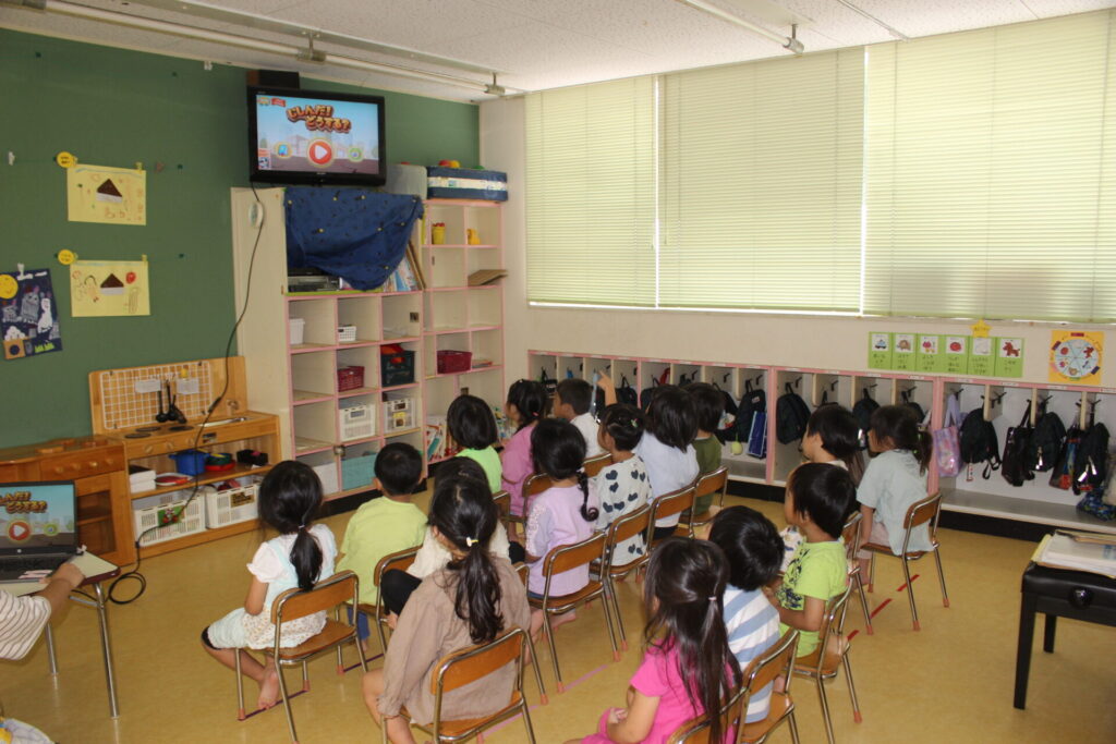 クラスごとにダンゴムシポーズの練習をしたり、『おはしも』の振り返りをしたり、紙芝居や動画を見て学んだりしました。