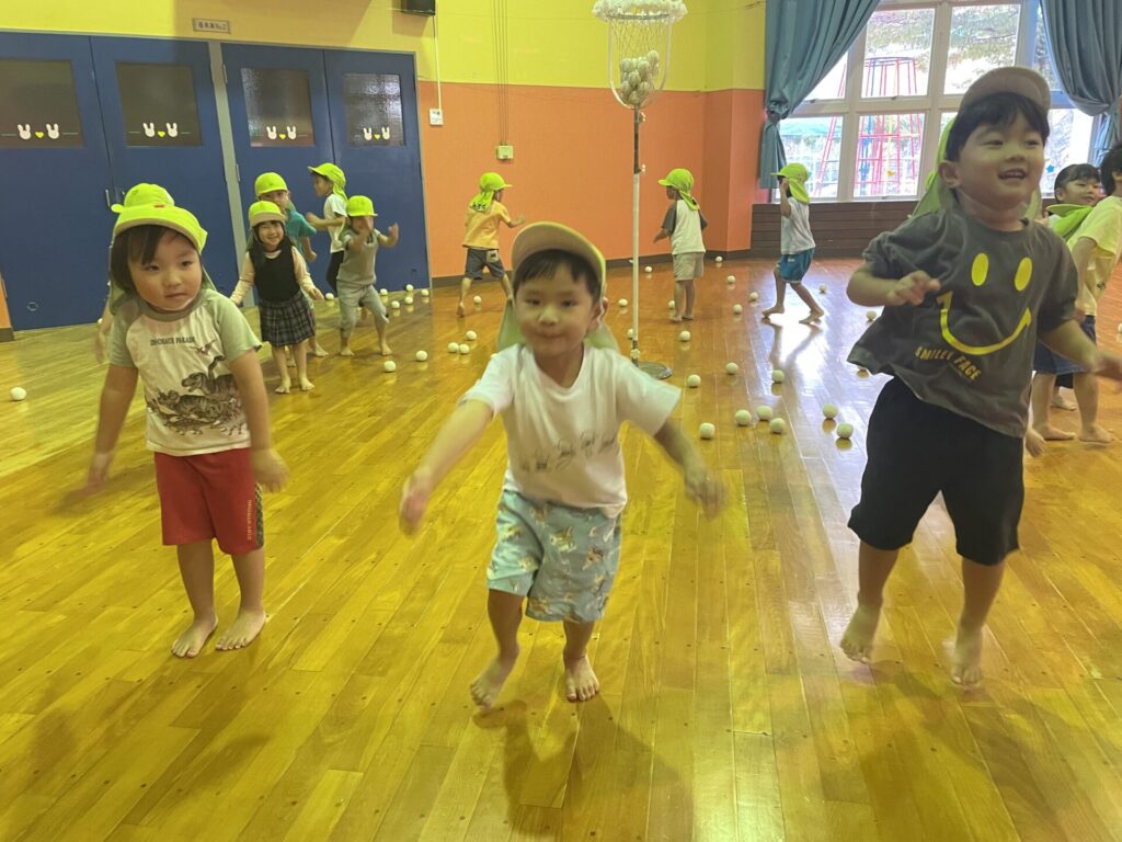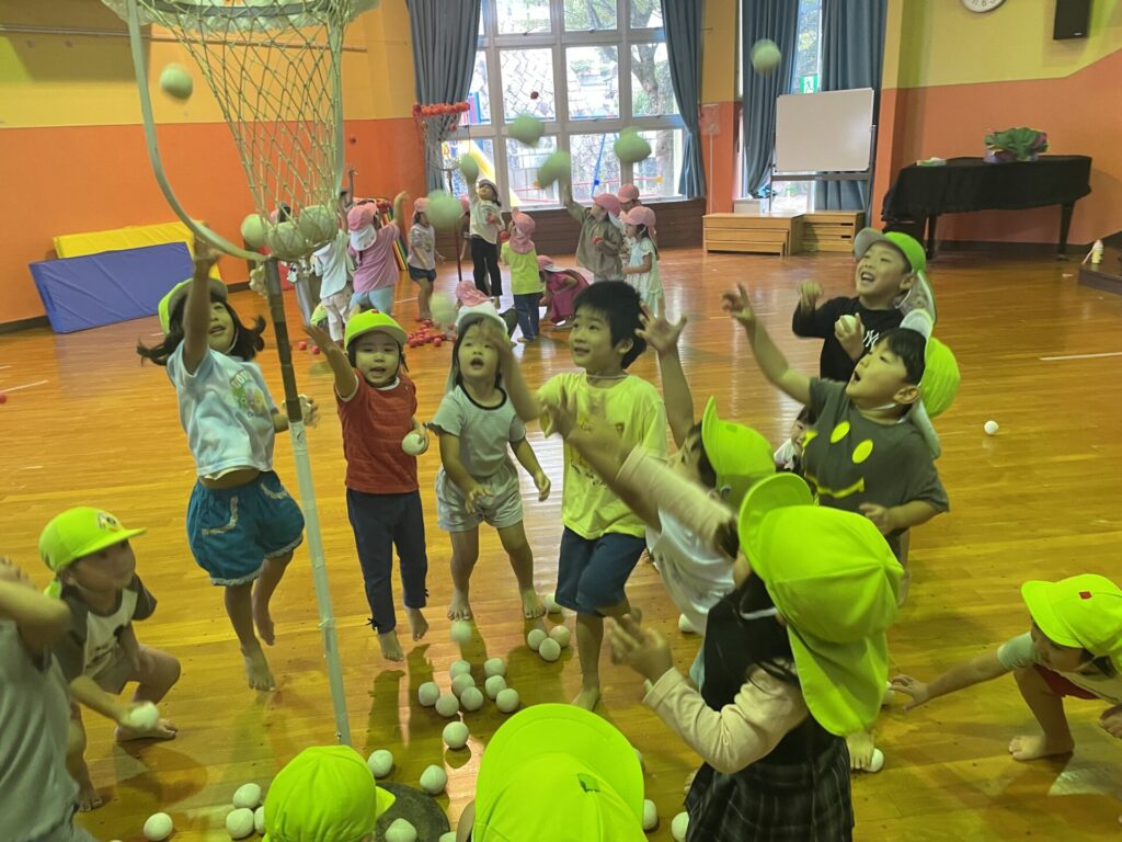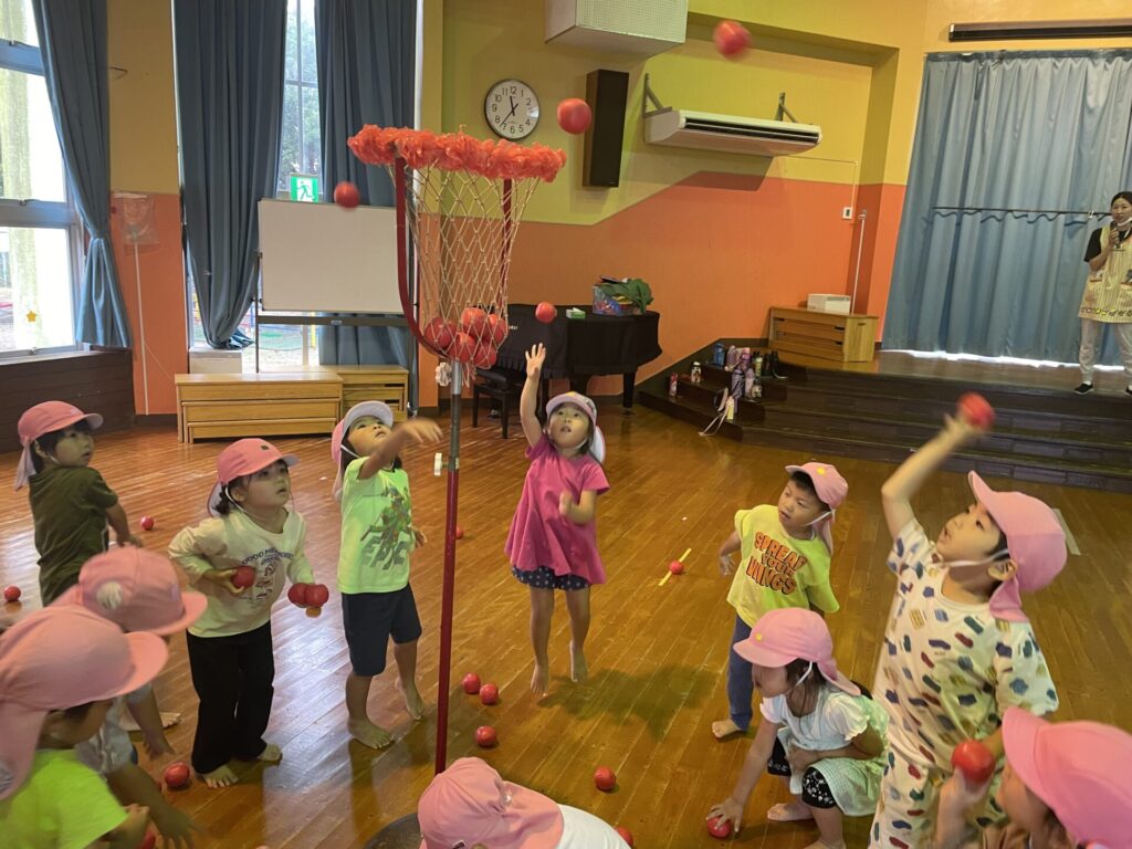 玉入れの練習では、かごをめがけて一生懸命な子どもたち!