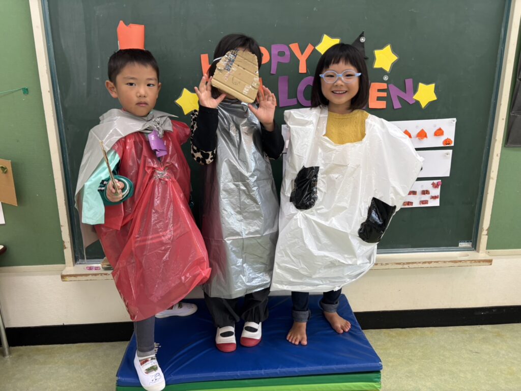 自分で作ったハロウィンのアイテムを身に着けて、遊戯室へ出発☆