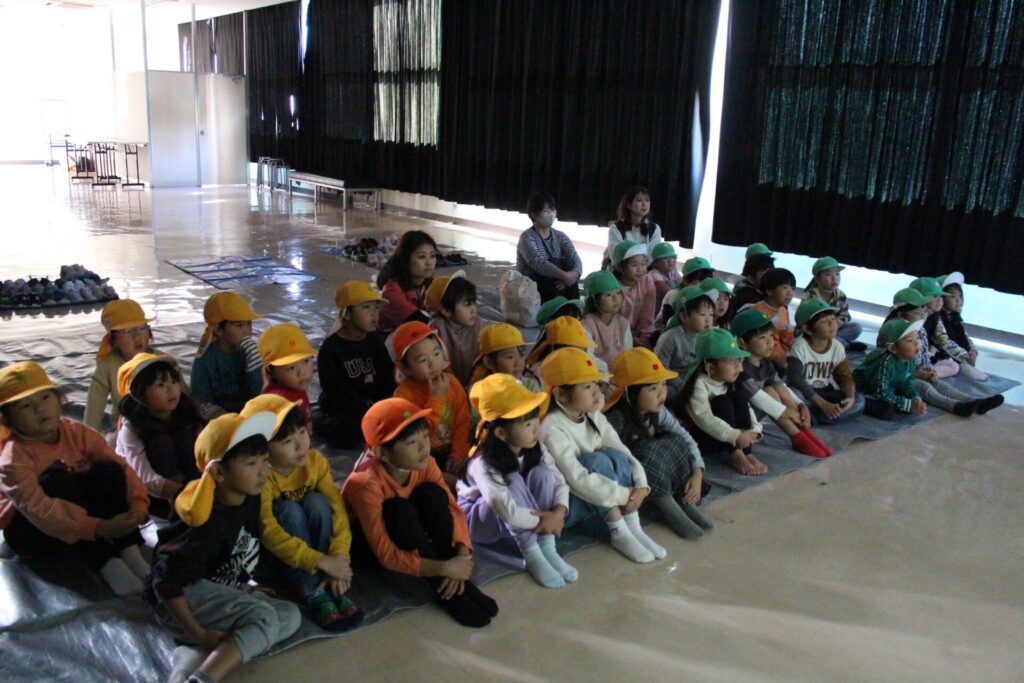 まず、指導員さんのお話を聞いて、交通安全教室の始まりです。