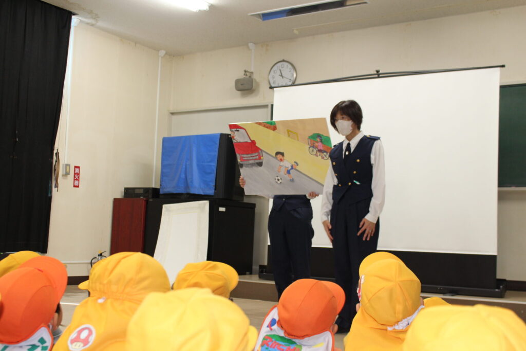 室内では、交通安全のビデオをみたり、イラストを見てお勉強しました。