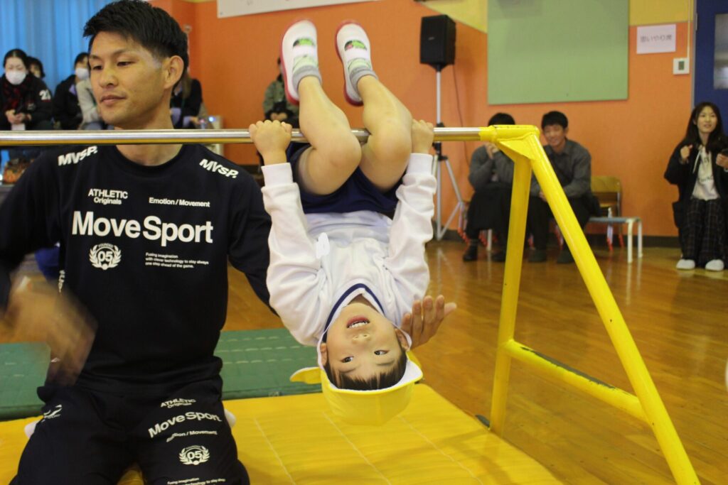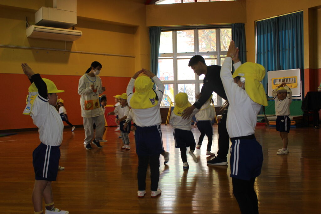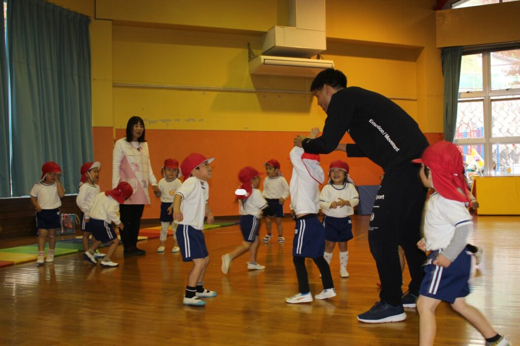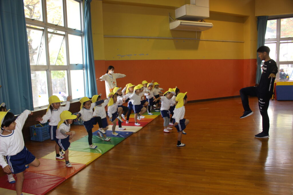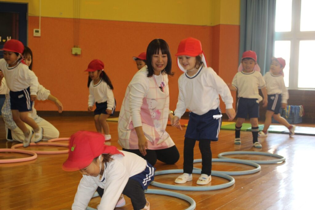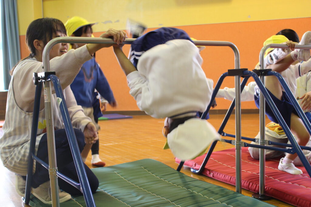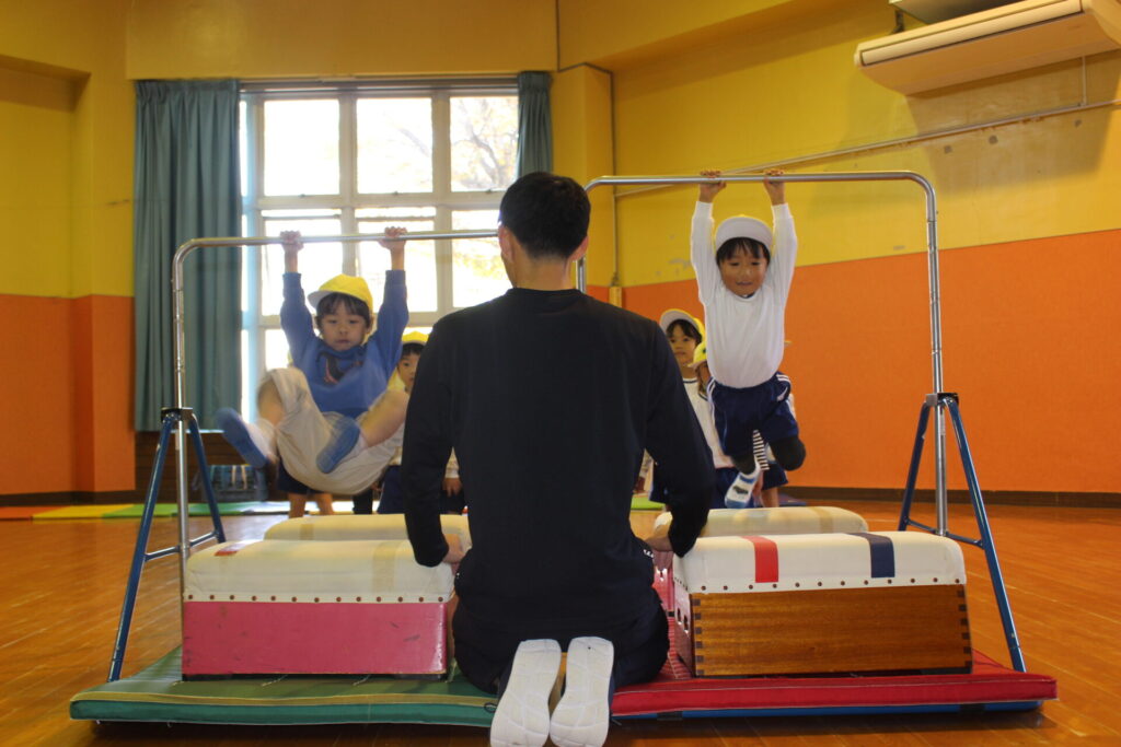 体操参観の活動は、①準備体操(フープ運動)②鉄棒(足かけ回り、前回り)③ばなな鬼ごっこでした!!