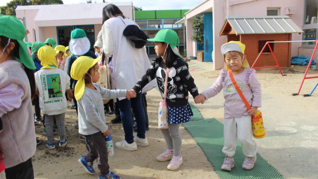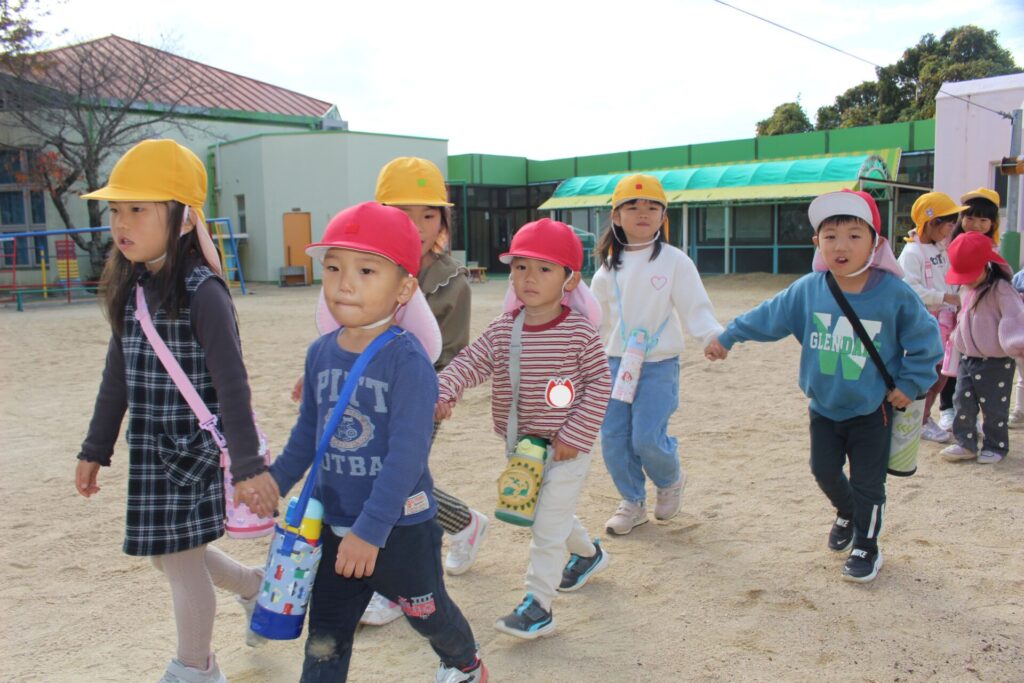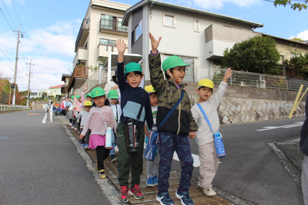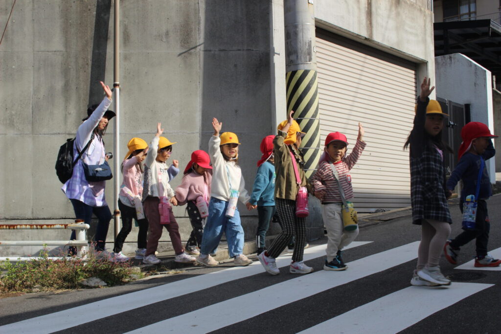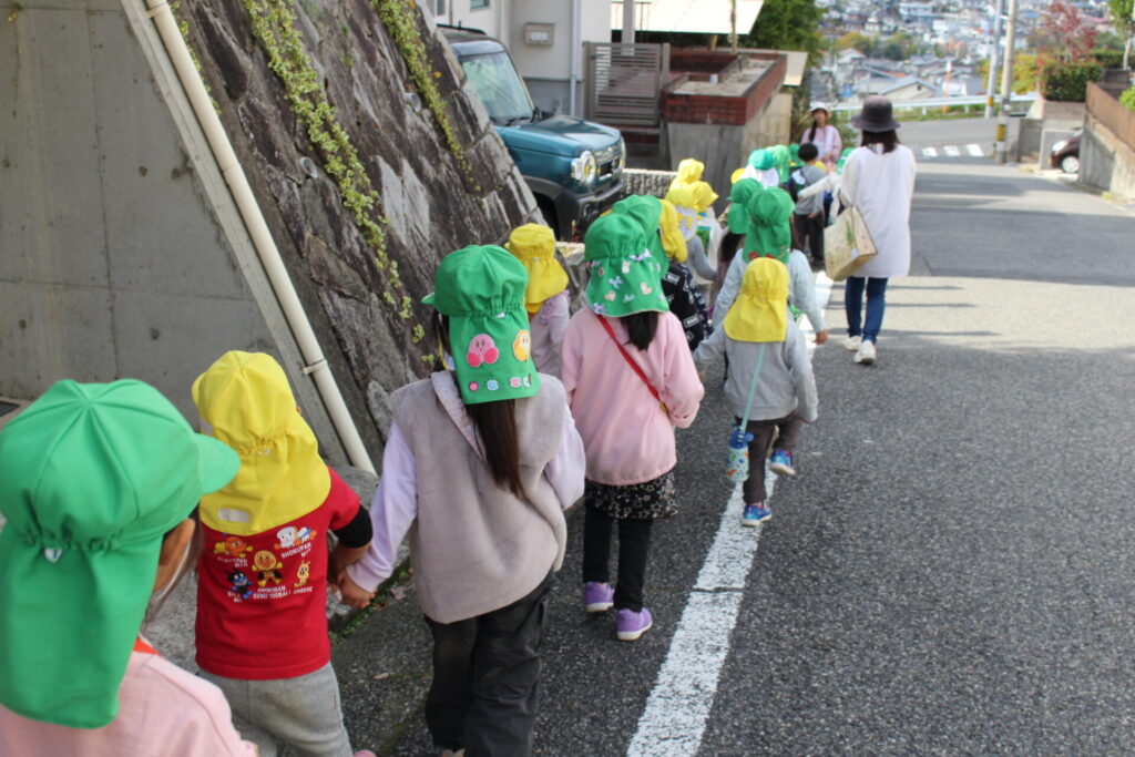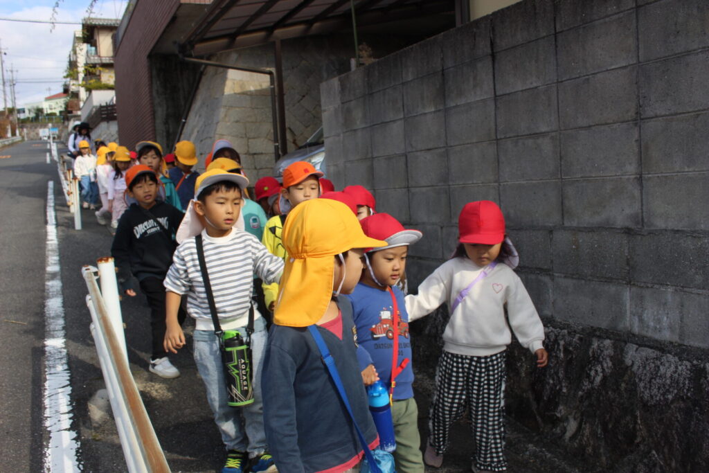 歩いている間は、年長さんが歩幅を合わせてあげたり、「段差あるよ」「気をつけてね」と声をかけたり、優しい関わりがたくさん見られました。年少さんもお兄さん・お姉さんと手をつなげることが嬉しいようで、会話を楽しみながら、ゆっくりと安全に歩いて行きました。