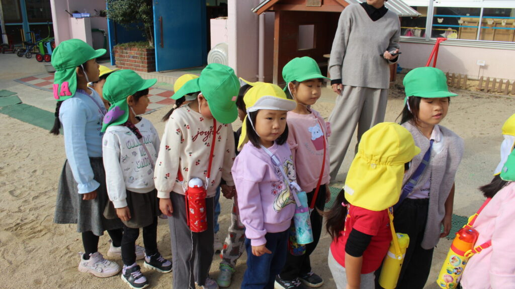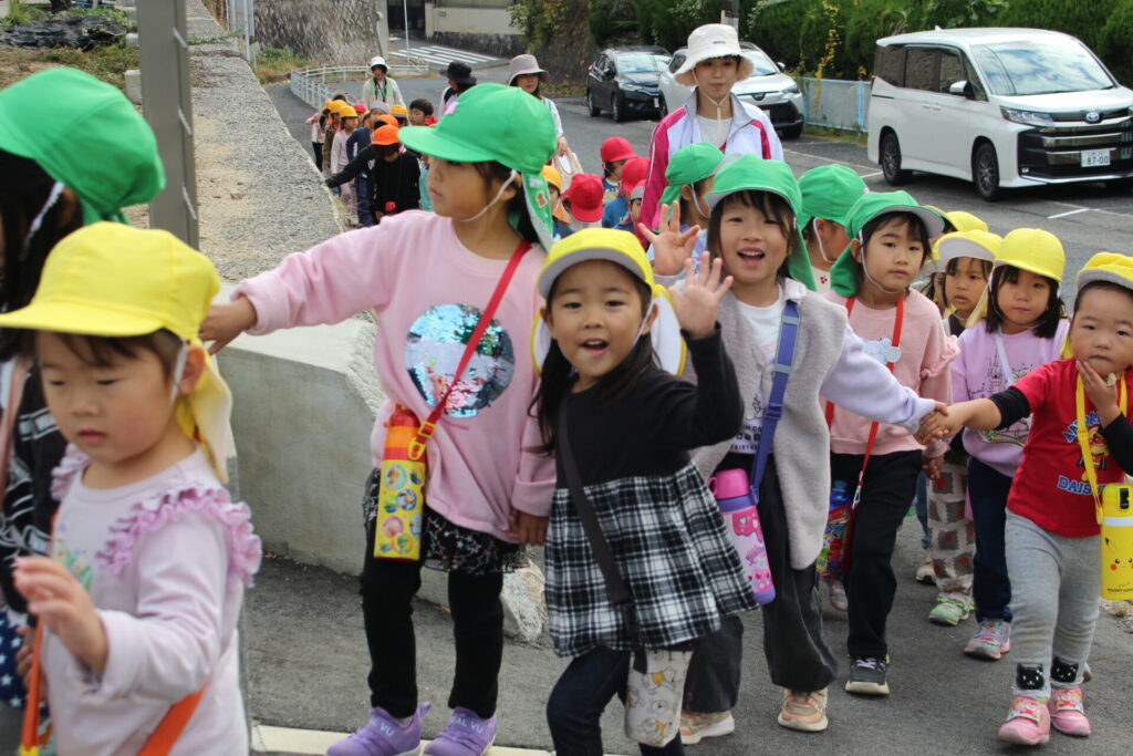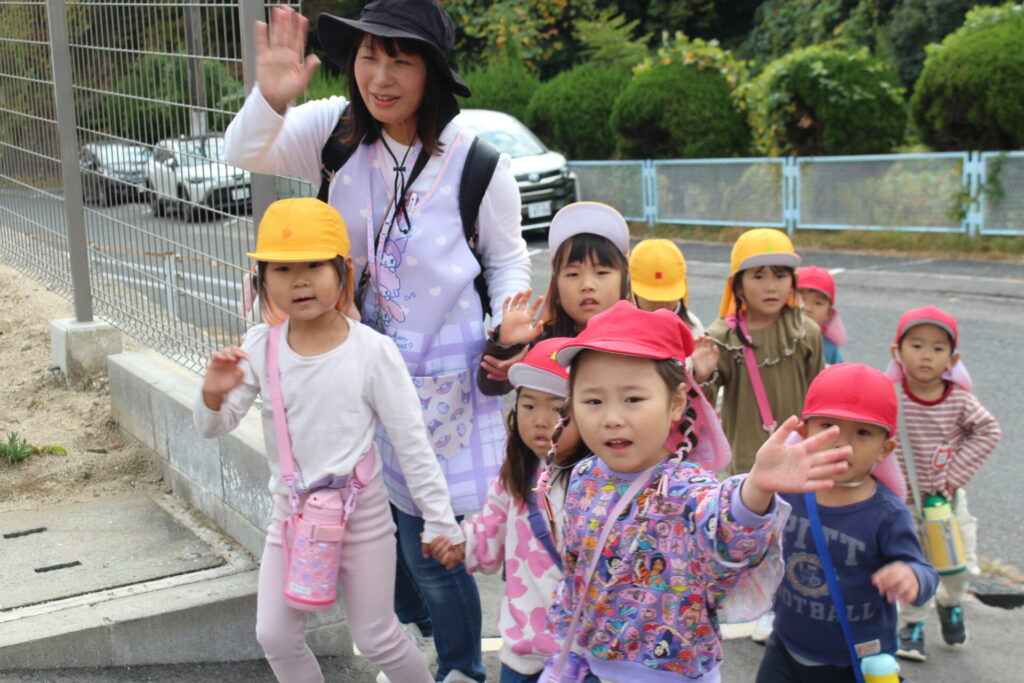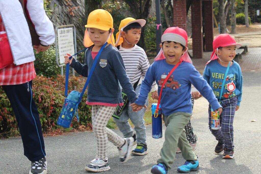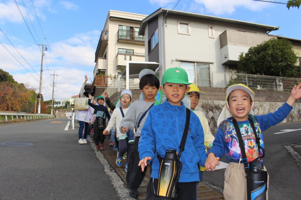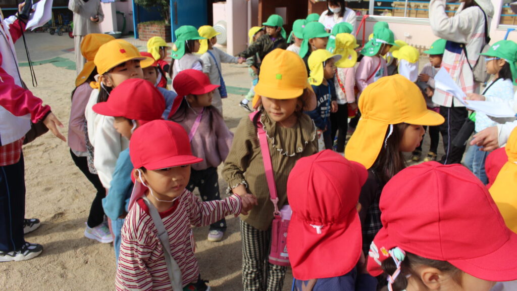 歩いている間は、年長さんが歩幅を合わせてあげたり、「段差あるよ」「気をつけてね」と声をかけたり、優しい関わりがたくさん見られました。年少さんもお兄さん・お姉さんと手をつなげることが嬉しいようで、会話を楽しみながら、ゆっくりと安全に歩いて行きました。