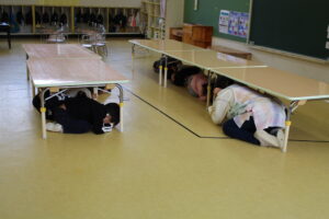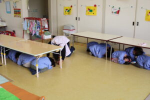 机の下に入って身を守ったり、口と鼻をおさえて避難したりと、子どもたちは先生と一緒に落ち着いて行動することができました。