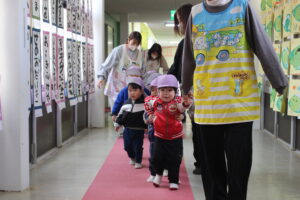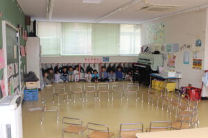 放送の合図で幼児クラスは、お部屋で静かに待機しました。