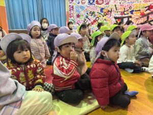 これまで節分のお話を聞いたり、鬼のお面を作ったりしながら、行事への期待を少しずつ高めてきました。 今日は豆ま…