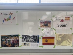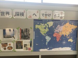 掲示には、世界地図や美術図鑑に掲載されたゲルニカの作品、舞台となったスペインの街、そしてスペイン出身の芸術家ピカソとその代表作品などを取り上げています。こうした視覚的な環境を通して、子どもたちは自分の身近な興味から世界へと関心を広げています。