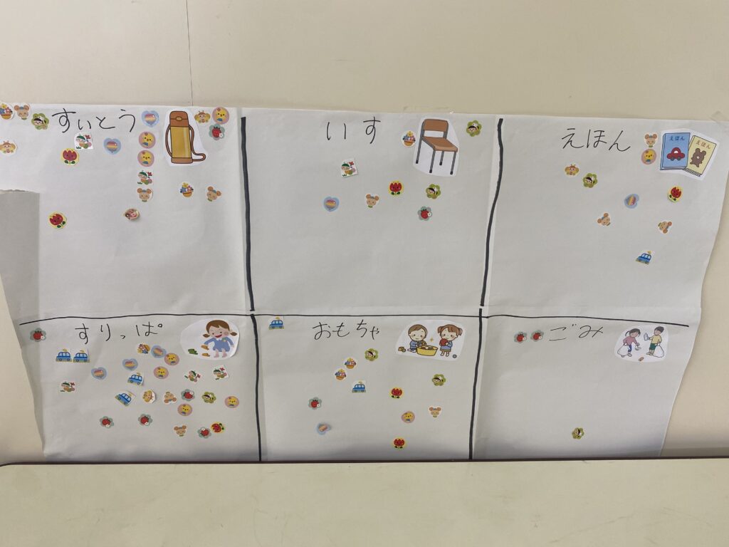 子どもたちは話し合いながら、スタークラスは、「すいとう」「いす」「えほん」「おもちゃ」「ごみ」など、ムーンクラスでは、「くつばこチェック」「ごみのチェック」「わすれものチェック」など、クラスの生活に必要な役割を自分たちで考え、自分ができそうな係を選んで、分担しています。