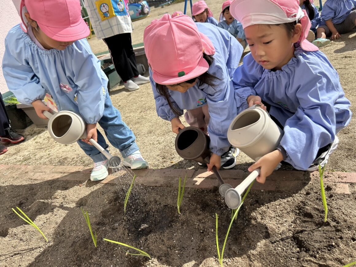 年少組・年中組が玉ねぎの苗を植えましたよ!(^^)!今日はスペシャルゲストとして、畑に詳しい方に教えてもらい…