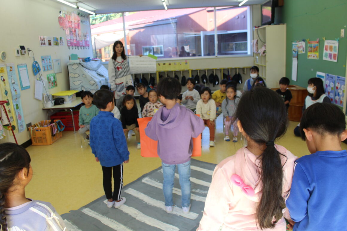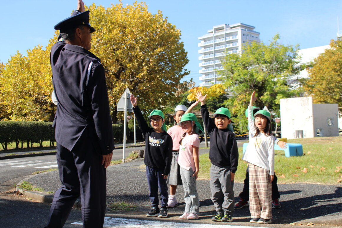大迫公園に年少さんとお散歩に行く前に、年長さんが年少クラスに行き交通ルールについて伝えに行きました。 先日、…