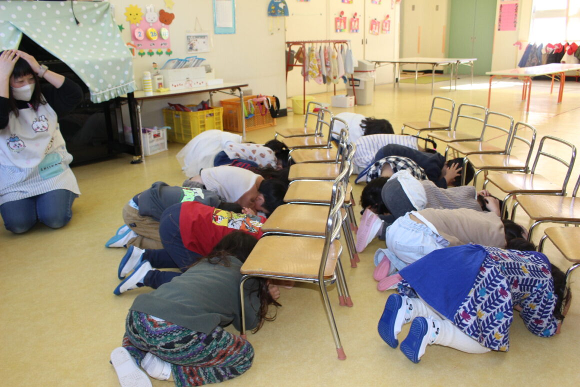 今年度最後の避難訓練は、『地震』を想定した行動をしました。 「地震が発生しました!」「先生のお話を聞いて、揺…